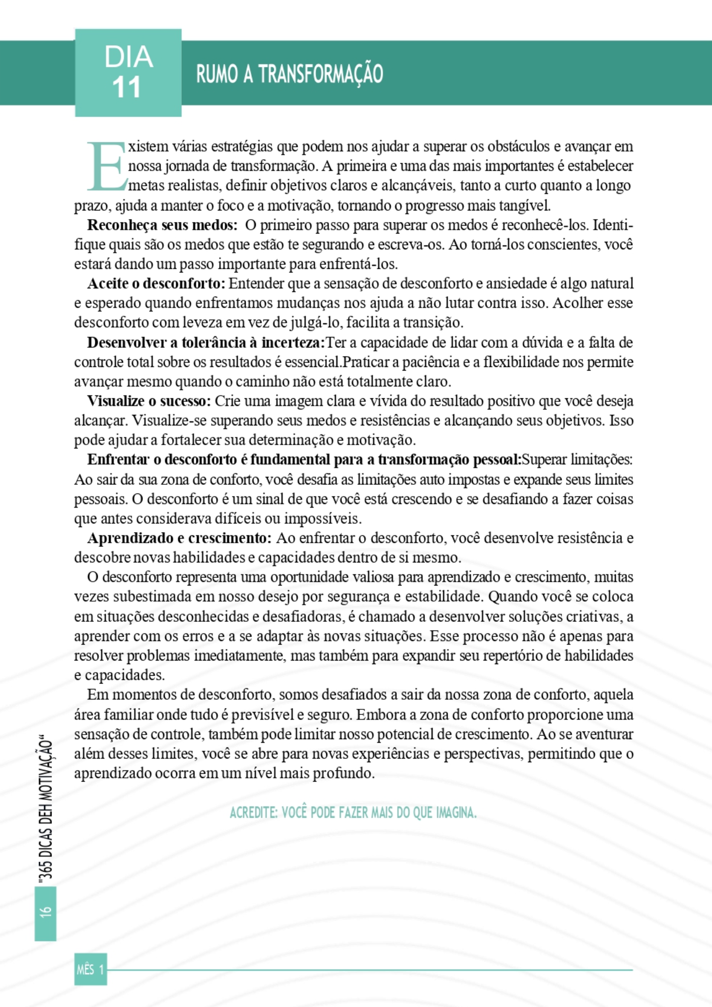 Pequenas mudanças diárias podem criar impactos extraordinários! Imagine acordar todos os dias com uma nova dose de motivação para construir a melhor versão de si mesmo.